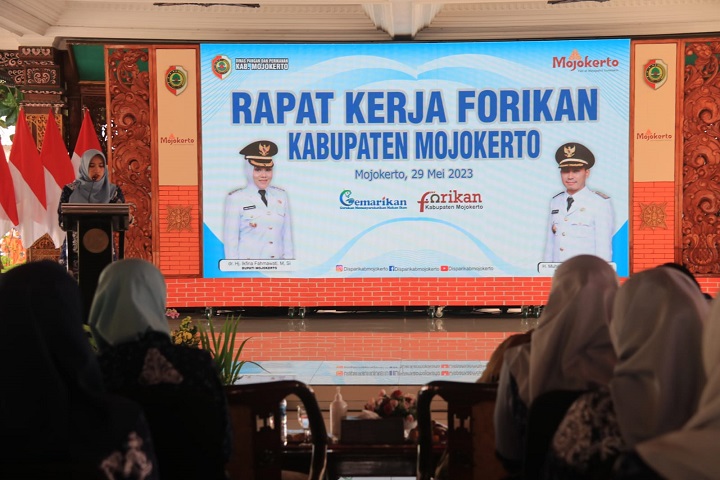 SURABAYAPAGI.COM, Mojokerto - Bupati Mojokerto Ikfina Fahmawati membuka secara langsung Rapat Kerja (Raker) Forum Peningkatan Konsumsi Ikan (Forikan) Tahun 2023. Pelaksanaan raker tersebut dilakukan sebagai upaya Pemerintah Kabupaten (Pemkab) Mojokerto untuk membangun kesadaran individu maupun seluruh masyarakat agar gemar mengkonsumsi ikan.