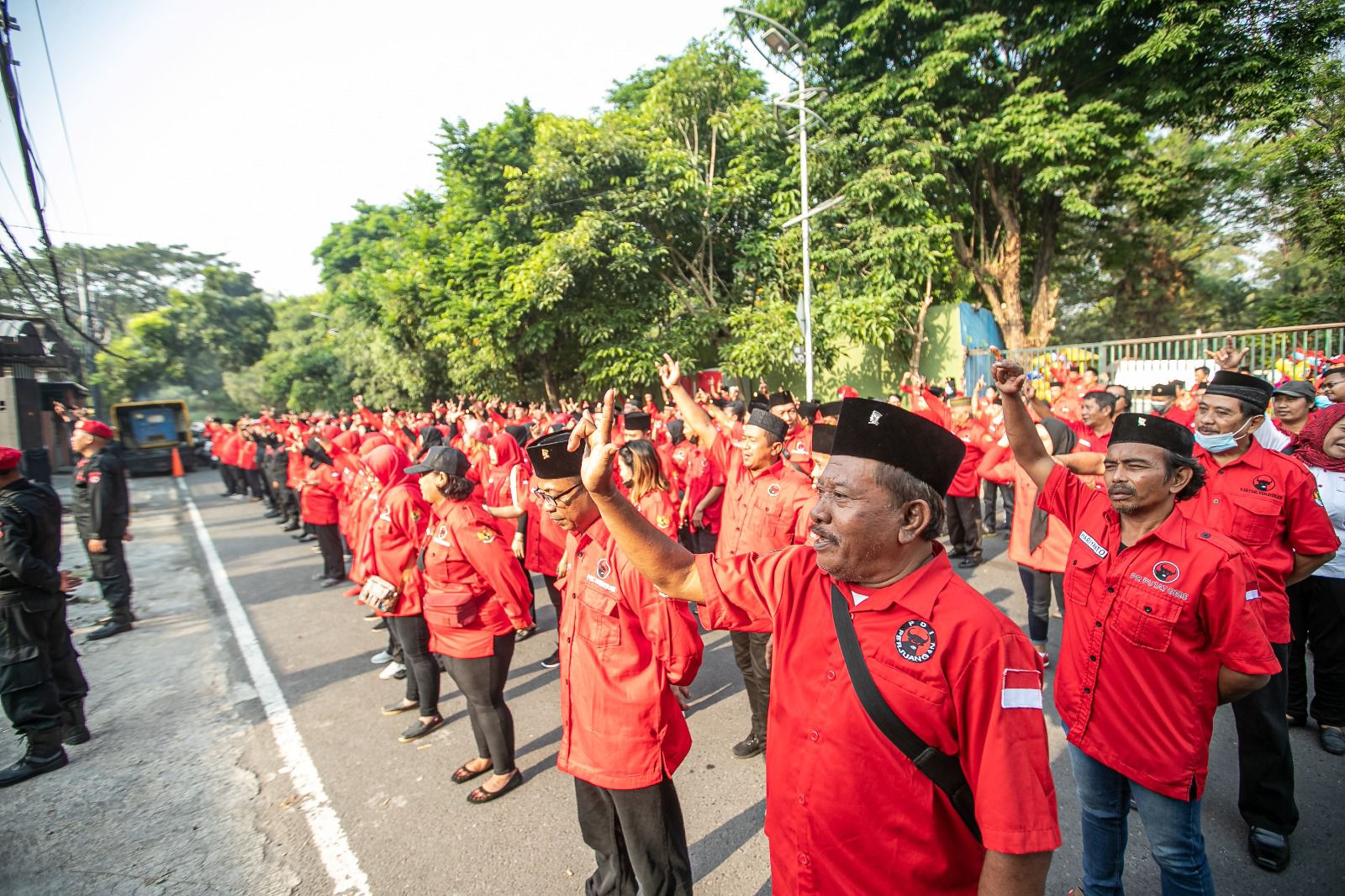 Sebagian lain memakai seragam PDI Perjuangan. Upacara dipimpin Sekretaris DPC PDI Perjuangan Kota Surabaya, Baktiono, selaku inspektur.