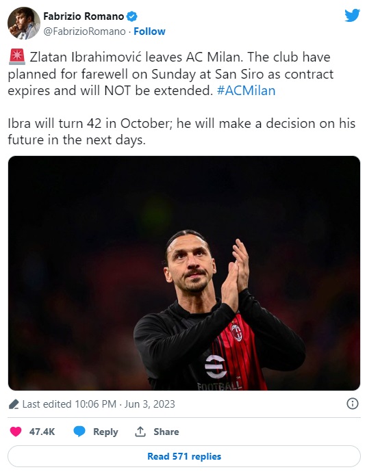 Diketahui, menurut laporan Fabrizio Romano di akun media sosial Twitter resminya, Zlatan Ibrahimovic akan meninggalkan AC Milan pada 30 Juni 2023. Pemain 41 tahun itu sebelumnya bergabung pada 2020 dan berhasil mempersembahkan Scudeto ke San Siro.