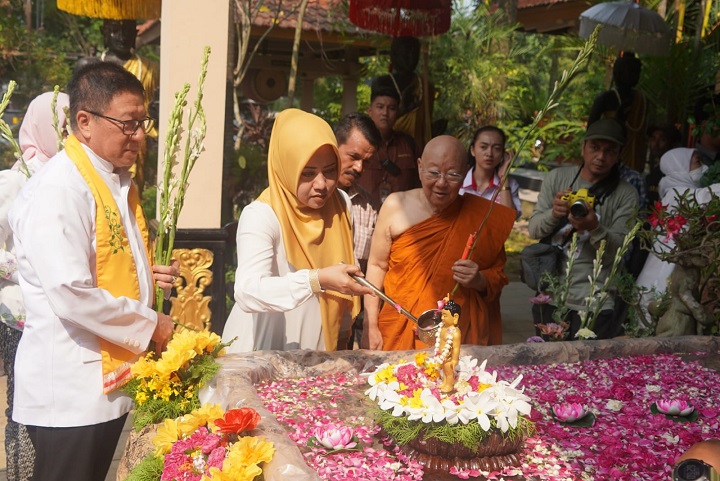 Sebelumnya, Bupati Ikfina bersama bhante Viriyanadi Mahatera menyaksikan rangkaian ibadah perayaan Hari Raya Waisak, seperti prosesi Pradaksina yang merupakan salah satu prosesi ibadah ummat Buddha dan selanjutnya masuk ke dalam Vihara. Dwi