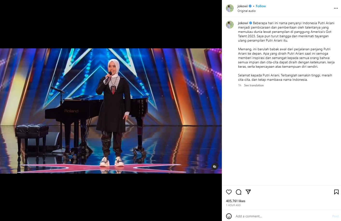 "Beberapa hari ini nama penyanyi Indonesia Putri Ariani menjadi pembicaraan dan pemberitaan oleh talentanya yang memukau dunia lewat penampilan di panggung America's Got Talent 2023. Saya pun turut bangga dan menikmati tayangan ulang penampilan Putri Ariani itu," kata Jokowi, dikutip dari akun Instagramnya @jokowi, Senin (12/06/2023).