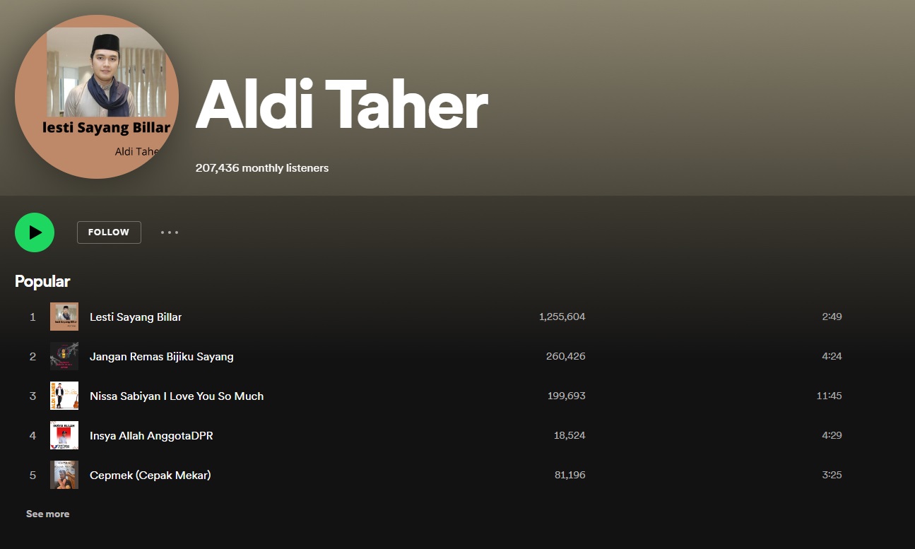 Sementara itu, diketahui saat melihat di situs resmi Spotify, lagu Aldi Taher pun tidak sedikit, bahkan tembus 200.000 lebih setiap bulan. Lebih tepatnya 207.436 pendengar bulanan, dikutip Jumat (16/06/2023),