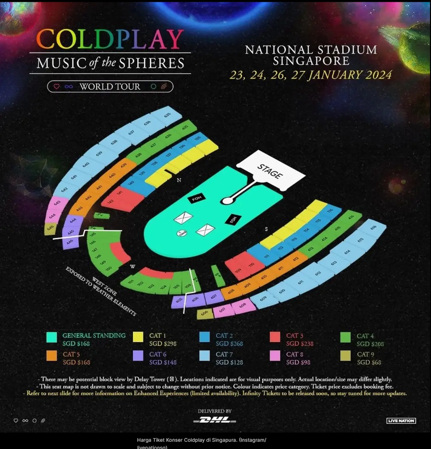 Berikut daftar harga tiket konser Coldplay Singapore, Mengutip akun Instagram resmi @livenationsg, Rabu (21/06/2023).