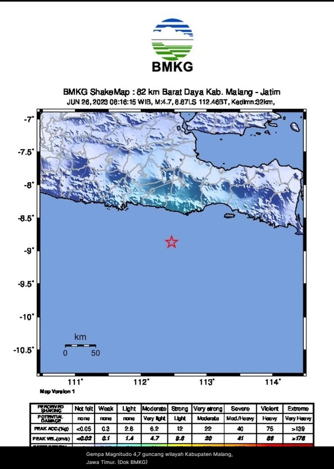 SURABAYAPAGI.com, Malang - Gempa bumi kembali melanda, kali ini gempa mengguncang Kabupaten Malang, Jawa Timur pada pagi ini, Senin (26/06/2023) sekitar pukul pukul 08.16.15 WIB dengan kekuatan 4,7 magnitudo. Hasil analisis BMKG melaporkan Episenter gempa bumi terletak pada koordinat 8.87° Lintang Selatan; 112.46° Bujur Timur