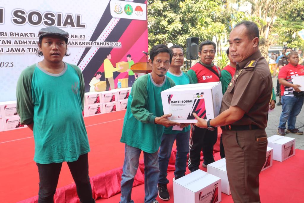 "Pemberian 100 paket sembako ini sebagai wujud kepedulian kami kepada para petugas kebersihan atau penyapu di sekitar Jalan A Yani. Bakti sosial ini juga dalam rangka memperingati Hari Bhakti Adhyaksa ke-63," kata Kepala Kejati (Kajati) Jatim, Mia Amiati.