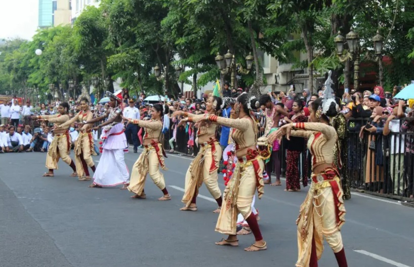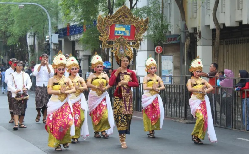SURABAYAPAGI.com, Surabaya - Pemerintah Kota Surabaya menggelar Surabaya Cross Culture International Folk Art Festival (SCCIFAF) 2023 ke-16 atau Parade Deville yang sempat terhenti 3 tahun selama Covid-19 lalu. Diketahui, sebanyak tujuh negara dan sejumlah daerah asal Indonesia saling unjuk gigi tari kebudayaannya masing-masing di Jalan Tunjungan, Surabaya, Minggu (16/07/2023).