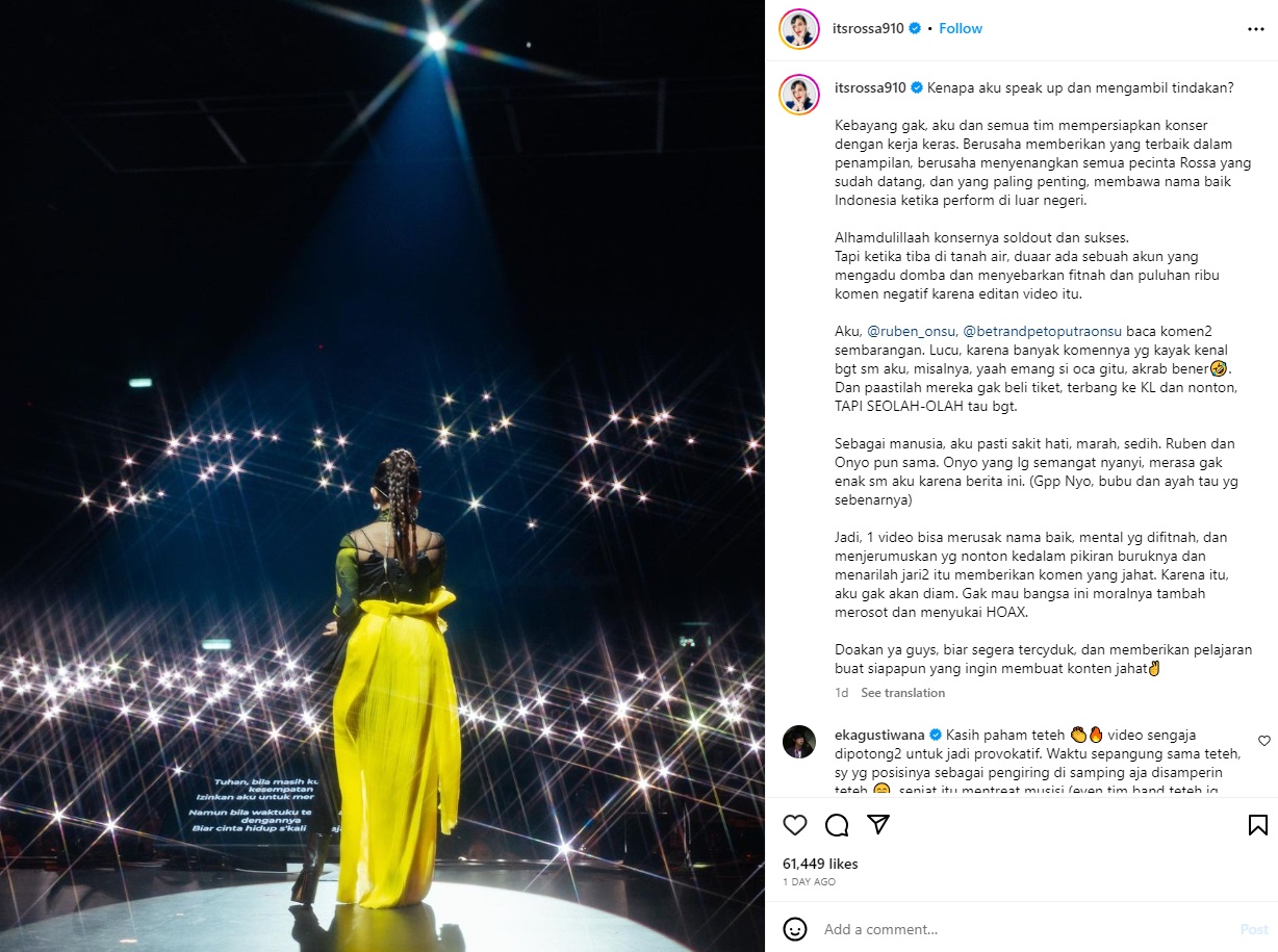 "Nyanyi ber3 itu pasti ada pembagian part. Ada part aku, Onyo, dan Iky. Yang di upload dan dijadikan konten fitnah adalah part Iky nyanyi dan (pastinya) aku liatnya ke Iky. Masa Iky nyanyi aku liatnya ke Onyo, sampe sini semoga paham," jelas Rossa.