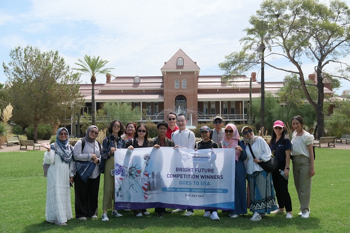 SURABAYAPAGI.com, Arizona, 18 Juli 2023 – Sebagai kelanjutan dari FUTURISME Highschool Students Competition yang merupakan rangkaian Bright Future Competition (BFC) 2023, Sampoerna University memberangkatkan empat pemenang dari Jakarta dan Surabaya ke Arizona, Amerika Serikat. Mereka adalah Cheryl Loemantoro (Kategori Green Engineering Innovation), Darlene Riama Hutauruk (Kategori Green Business Plan), Muhammad Hanif (Kategori Green Short Movie), dan Cyra Anindya Alesha (Social Media Competition). Selama berada di Amerika, keempat pelajar sekolah menengah atas ini bisa melihat dan merasakan langsung serunya pengalaman kuliah di negeri Paman Sam.