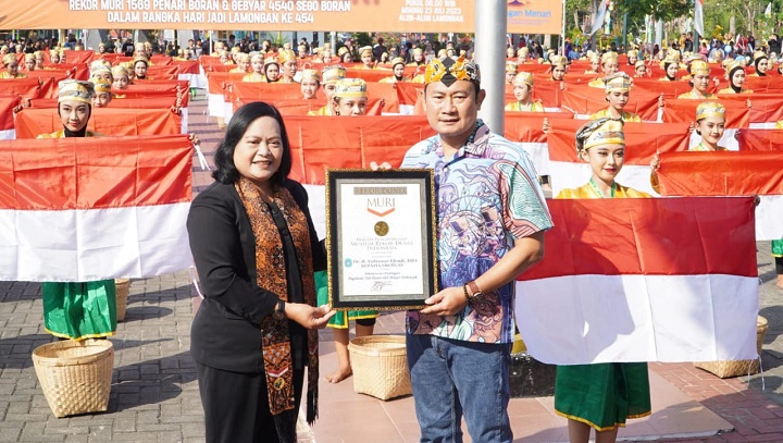 Penghargaan yang diserahkan oleh Senior Manager MURI, Sri Widayati, kepada Bupati Lamongan, Yuhronur Efendi, di Alun-Alun Lamongan dalam acara yang bertajuk “Lamongan Menari”, menjadi kado terindah bagi Lamongan dalam rangka hari jadi Lamongan ke-454.