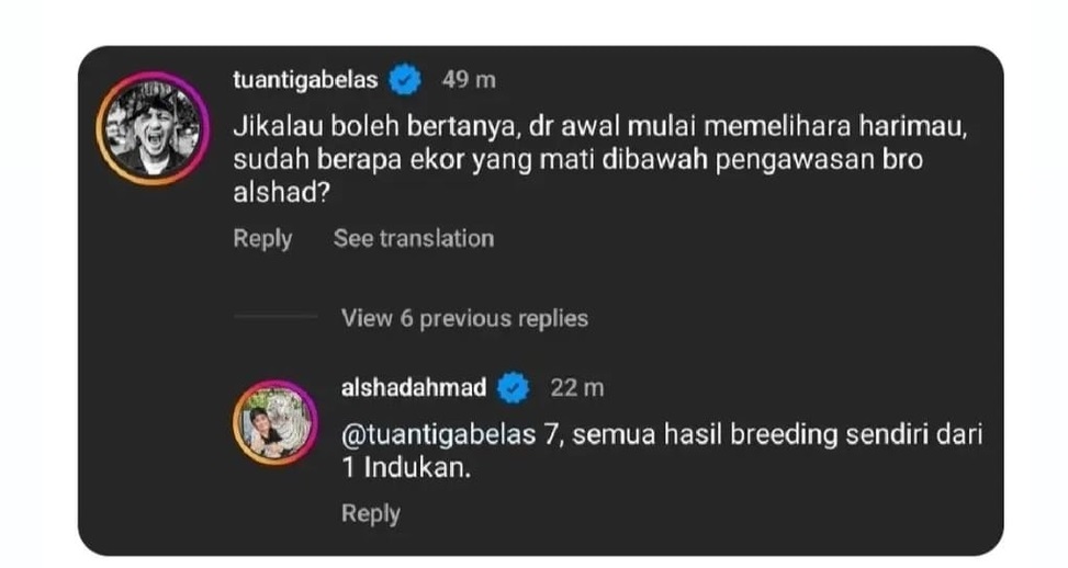 "Jikalau boleh bertanya, dr awal mulai memelihara harimau, sudah berapa ekor yang mati dibawah pengawasan bro alshad?" tulisnya.
