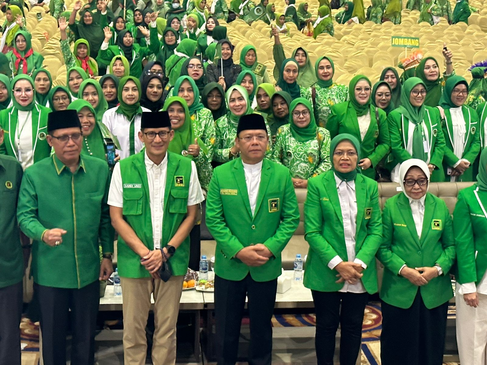 SURABAYAPAGI.COM, Surabaya - Pengurus DPP Wanita Persatuan Pembangungan (WPP) resmi dilantik Plt Ketum Partai Persatuan Pembangunan (PPP) Mardiono di Surabaya, Sabtu (30/7/2023). Pelantikan disaksikan langsung Sandiaga Uno yang juga Ketua Badan Pemenangan Pemilu DPP PPP.
