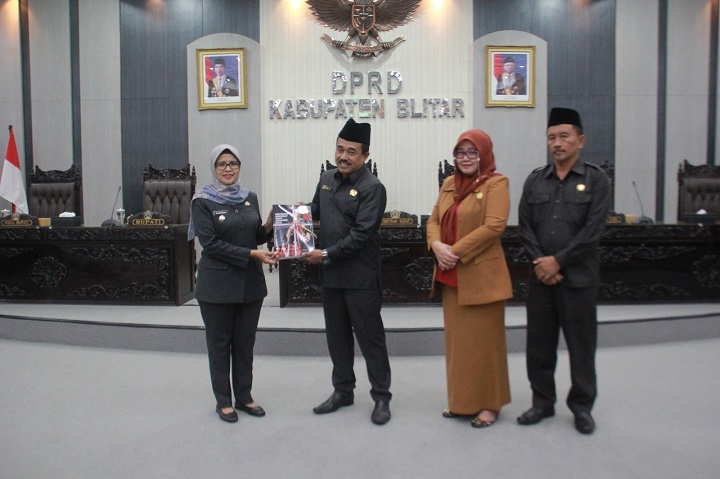Paripurna diakhiri dengan penyerahan buku pedoman tentang perumusan KUA PPAS oleh Bupati kepada M Rifai Wakil Ketua DPRD Kab Blitar di dampingi dua wakilnya Narulita dan Mujib. Les/Humas Dprd Kabupaten Blitar