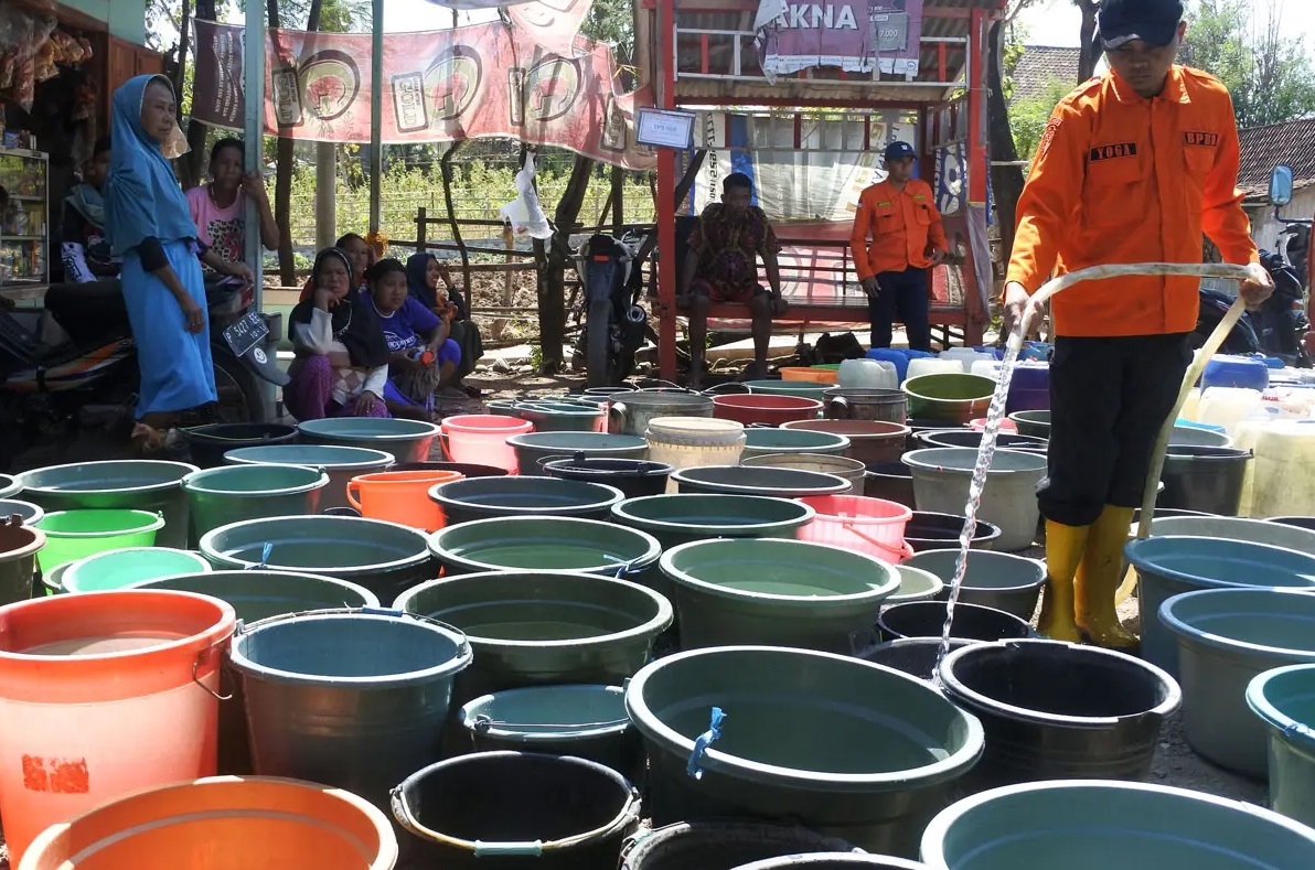 Warga yang dilanda krisis air bersih pun rela berjalan kaki berkilometer menuruni jurang terjal lalu menunggu antrean pembagian air lantaran bergantian dengan warga lainnya.