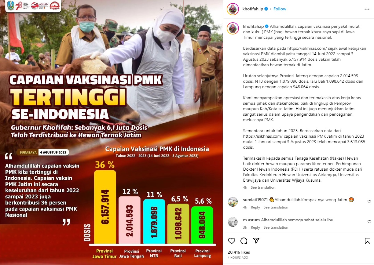 “Alhamdulillah, capaian vaksinasi penyakit mulut dan kuku (PMK) bagi hewan ternak khususnya sapi di Jawa Timur mencapai yang tertinggi secara nasional,” ungkap Khofifah yang dikutip dari Instagramnya, Senin (07/08/2023).