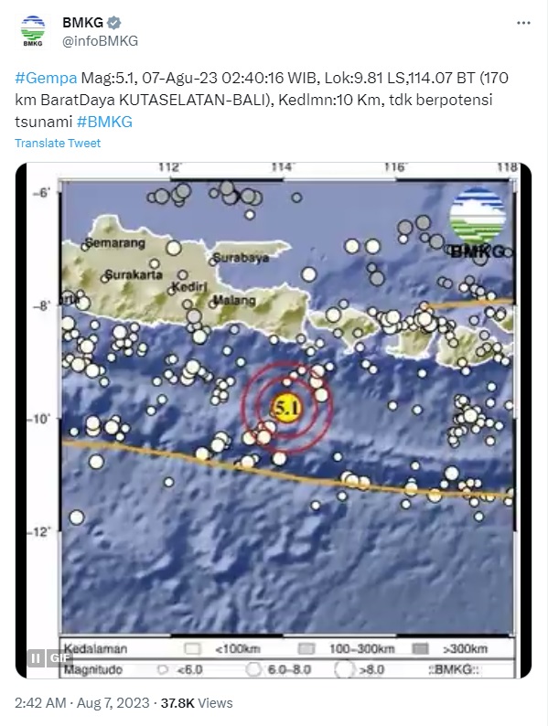 SURABAYAPAGI.com, Bali - Badan Meteorologi, Klimatologi, dan Geofisika ( BMKG) melaporkan adanya gempa bumi berkekuatan 5,1 Magnitudo mengguncang wilayah Kuta Selatan, Bali pada Senin (07/08/2023) dini hari.
