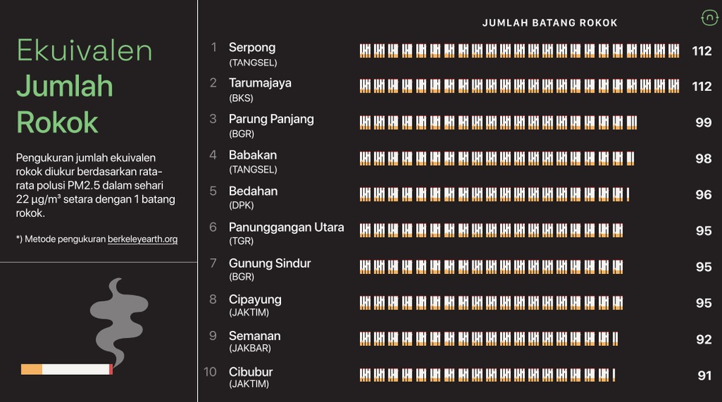 - Serpong (Tangerang Selatan): polusi setara 112 batang rokok sehari: Tingkat konsentrasi PM 2.5 berada di 80 μg/m3.