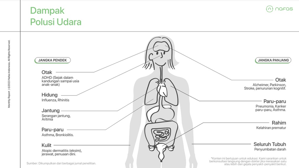 Salah satu aplikasi pemantau kualitas udara, Nafas Indonesia, baru-baru ini merilis 10 wilayah dengan konsentrasi polusi PM 2.5 tertinggi selama Juli 2023, disebut berkali-kali lipat melampaui pedoman Organisasi Kesehatan Dunia (WHO) 15 μg/m3. Misalnya, Serpong Tangerang Selatan, konsentrasi PM 2.5 mencapai 80 μg/m3, masuk kategori merah alias tidak sehat, dikutip Kamis (10/08/2023).