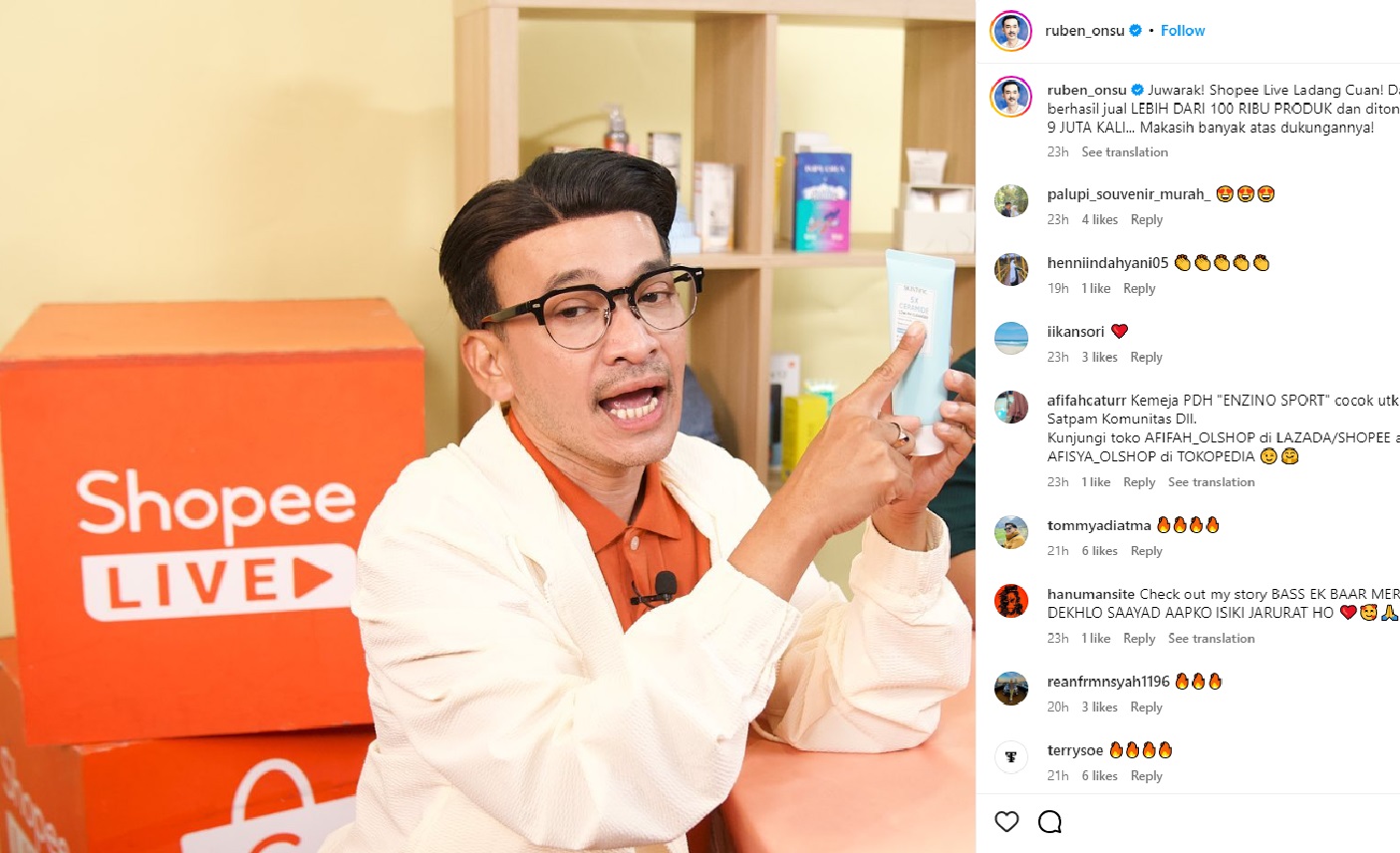 “Juwarak! Shopee Live Ladang Cuan! Dalam sehari berhasil jual lebih dari 100.000 produk dan ditonton hingga 9 juga kali. Makasih banyak atas dukungannya!” tulis Ruben dalam caption unggahannya.