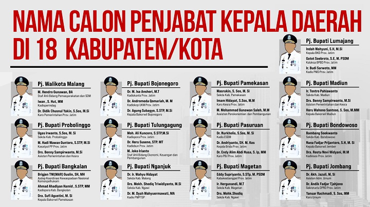 Diantaranya adalah, Calon Pj Bupati Bojonegoro ada nama Dr Isa Anshori MT Kepala Dinas Perikanan dan Kelautan Jatim, Dr Andromeda Qomariah Kadis Koperasi dan UMKM Jatim, Dr Agung Subagyo Kepala Bakorwil Bojonegoro. Kemudian Calon Pj. Walikota Malang ada nama M Hendro Gunawan BA Staf Ahli Bidang Pemasyarakatan dan SDM Jatim, Iwan S Hut Kadisperindag Jatim, dan Dr Didik Chusnul Yakin Kepala Biro Pemerintahan Jatim.
