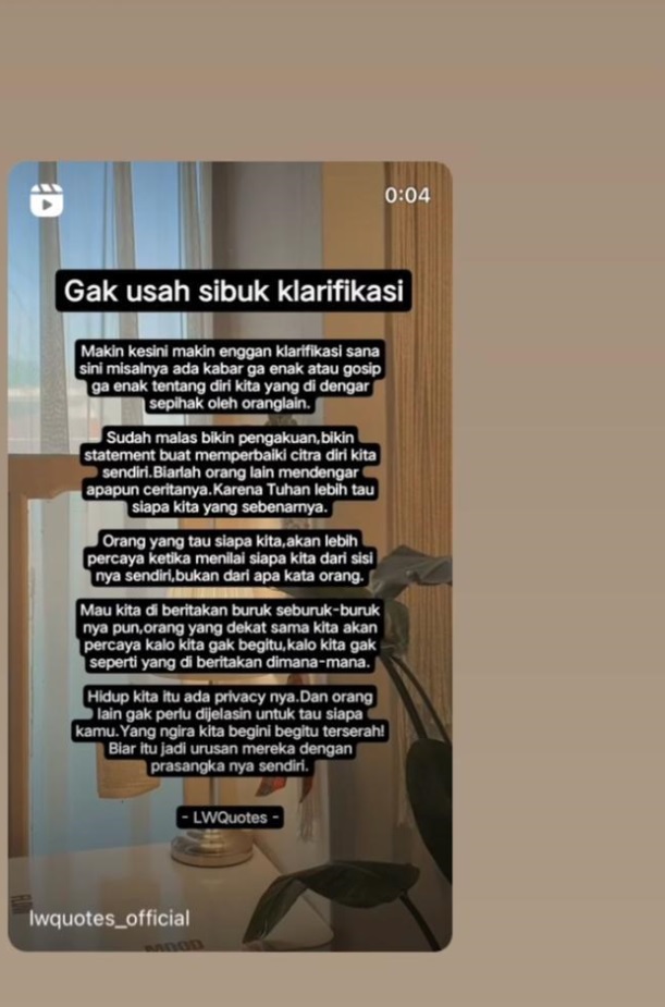Sebelumnya, Cesen juga mengunggah reels yang ia repost dari akun @lwquotes_official. Di reels tersebut, ada pembahasan soal klarifikasi. Di situ tertulis bahwa orang lain tak perlu tahu apa yang terjadi dalam hidup kita karena masing-masing orang memiliki privasi. Reels tersebut juga mengingatkan bahwa orang-orang terdekat pasti tahu seperti apa kita tanpa harus kita melakukan pengakuan.