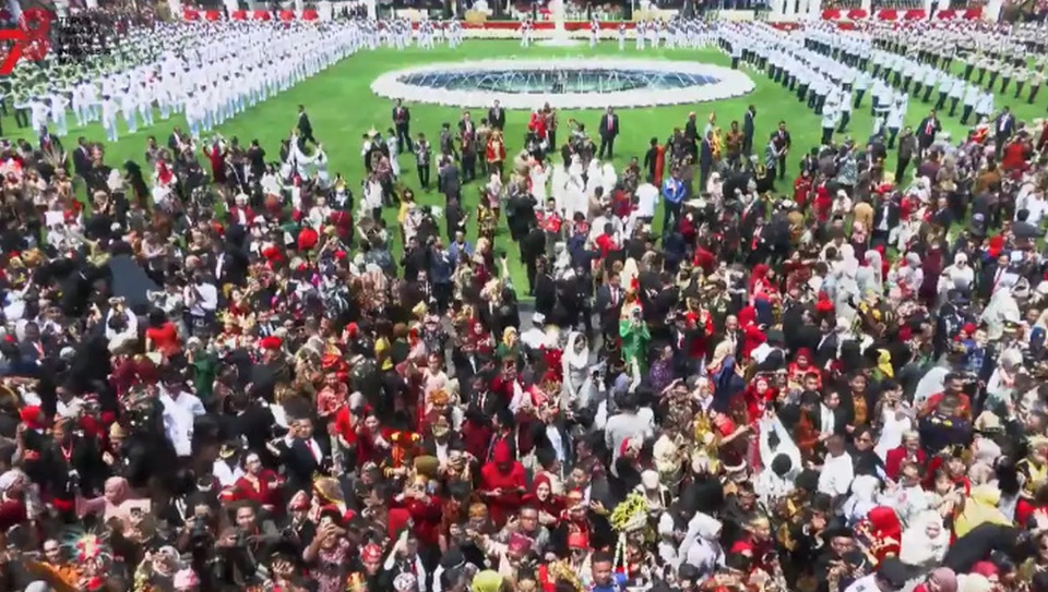 Saat lagu ‘Rungkad’ tersebut meriah dinyanyikan Putri Ariani, peserta dan tamu undangan juga tampak turun ke lapangan untuk berjoget bersama dengan pasukan upacara.