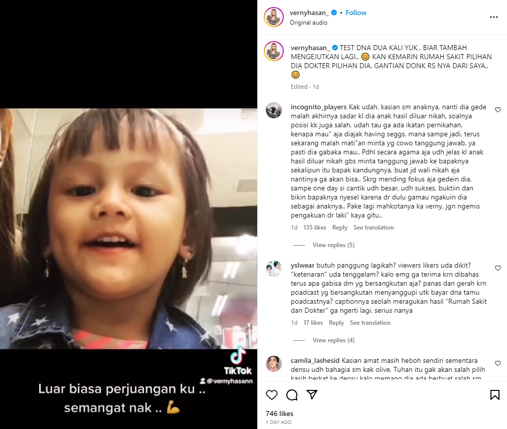 "TEST DNA DUA KALI YUK , BIAR TAMBAH MENGEJUTKAN LAGI," tulis Verny Hasan pada keterangan unggahannya di Instagram.