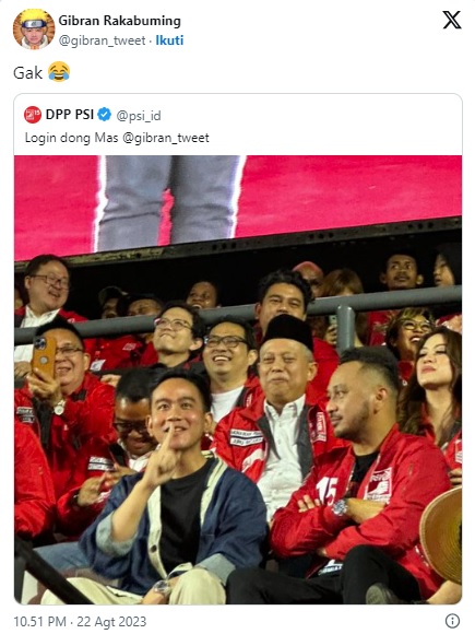 Namun Gibran langsung dengan tegas menjawab tidak dengan emoticon tertawa. Dalam tweet yang dibalas Gibran itu tampak ia sedang duduk di samping Ketua Umum PSI Giring Ganesha.