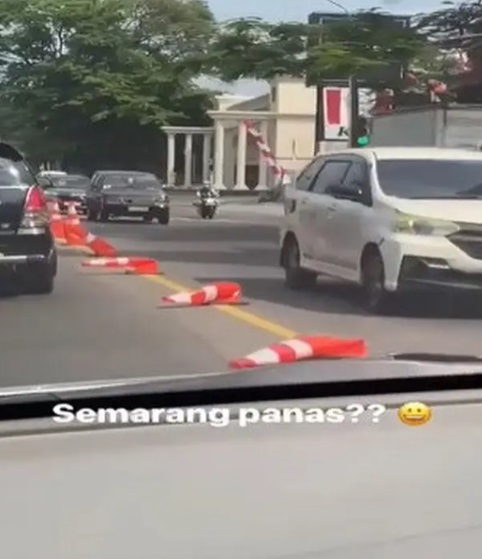SURABAYAPAGI.com, Semarang - Beredar video di media sosial (medsos) hingga viral oleh salah satu pengunggah akun Twitter @kegblgnunfaed, terlihat traffic cone atau pembatas jalan 'mleyot' di jalanan Kota Semarang. Penyebab traffic cone meleyot itu disebut-sebut akibat cuaca panas.