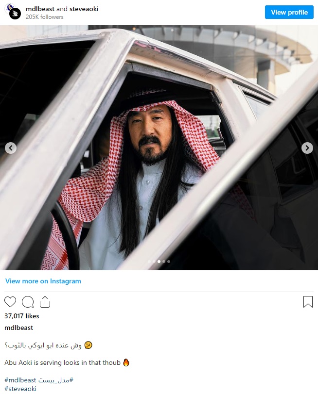 Momen unik dan sedang menjadi sorotan kali ini adalah, dalam unggahan Instagram miliknya, Steve Aoki terlihat mengenakan pakaian gamis berwarna putih yang bisa dikenakan oleh penduduk di Arab Saudi.