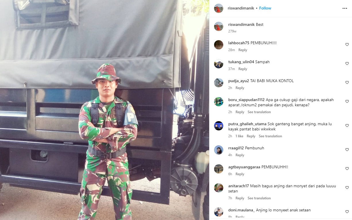 Kemudian, ada juga foto Praka RM terlihat sedang mengenakan pakaian dinas dan menggunakan senjata api. Netizen kemudian meninggalkan komentar hujatan di semua unggahan Praka RM.