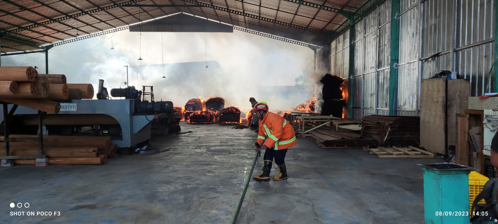 SURABAYAPAGI.COM, Blitar - Gudang pabrik Triplèk milik CV Indowood yang berada di desa Sumberjo Kelurahan/Kecamatan Talun Kabupaten Blitar terbakar pada Jumat 8 September 2023 sekitar pukul 15.00.