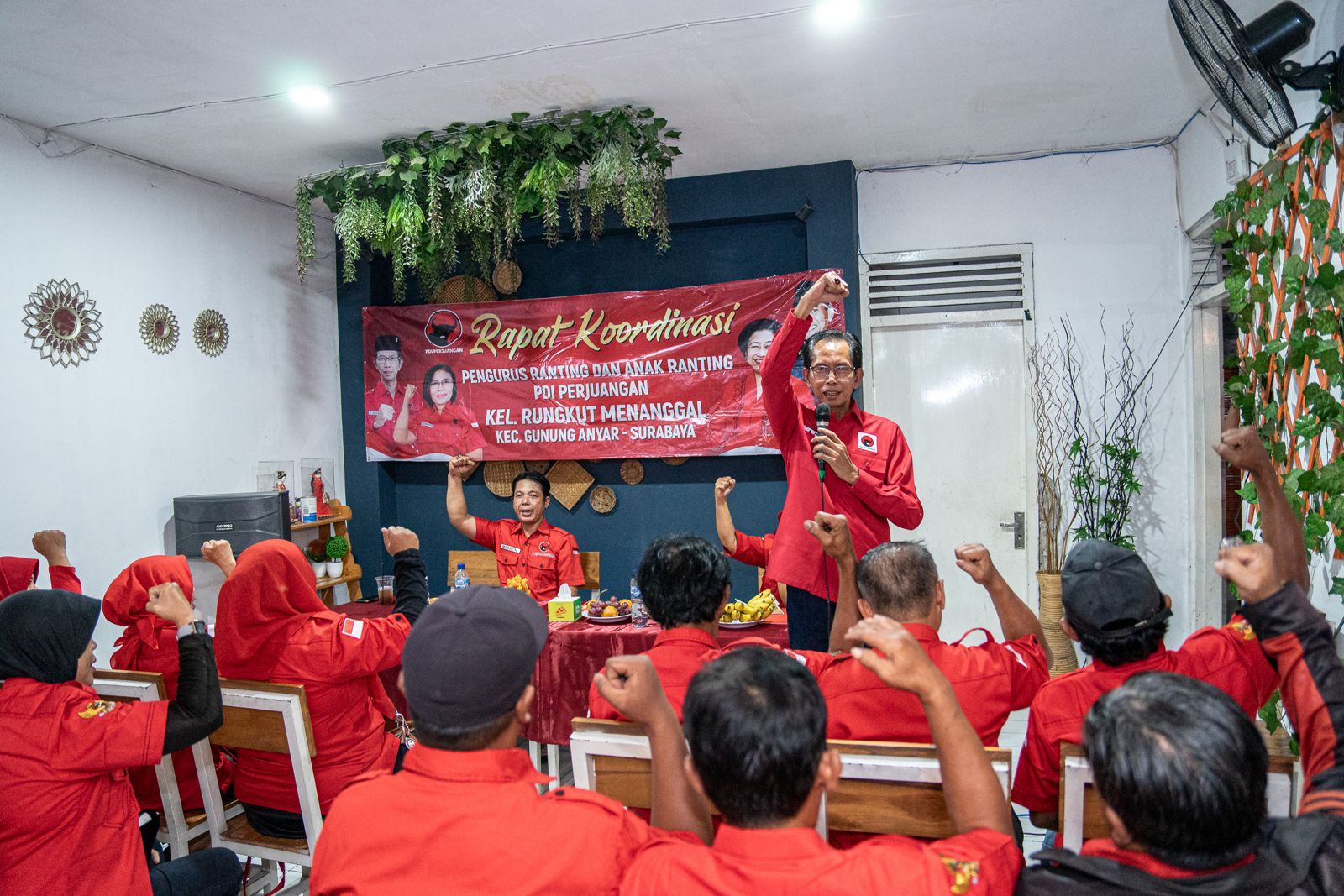 Pertemuan itu diikuti puluhan kader banteng di akar rumput dari kalangan pengurus Anak-Anak Ranting atau setingkat RW. Juga pengurus di level kelurahan atau Ranting. Dihadiri Ketua PAC PDI Perjuangan Kecamatan Gununganyar Reksa Ningsih dan Ketua Ranting PDI Perjuangan Kelurahan Rungkut Menanggal, Mesach.