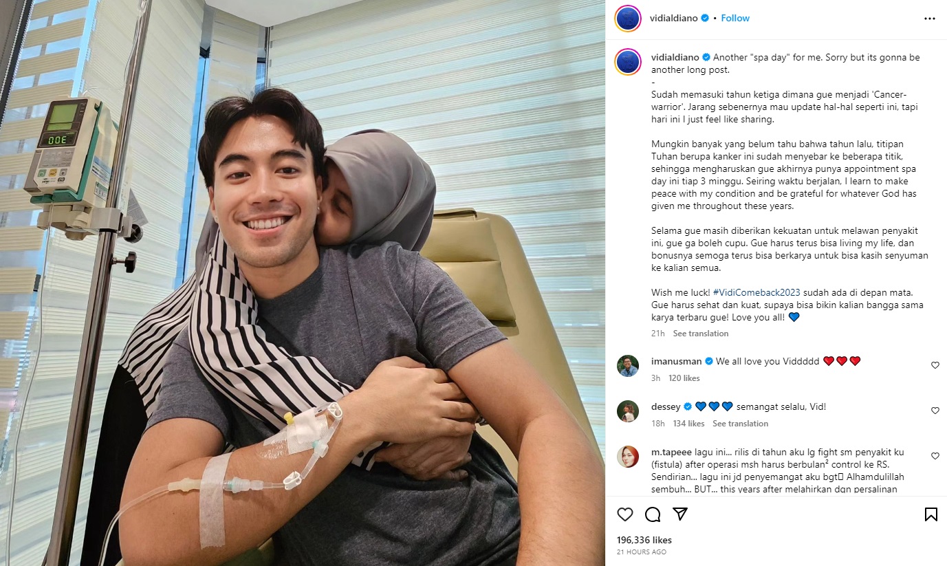“Another ‘spa day’ for me. Sorry but its gonna be another long post. Sudah memasuki tahun ketiga dimana gue menjadi ‘Cancer-warrior’. Jarang sebenernya mau update hal-hal seperti ini, tapi hari ini I just feel like sharing. Mungkin banyak yang belum tahu bahwa tahun lalu, titipan Tuhan berupa kanker ini sudah menyebar ke beberapa titik, sehingga mengharuskan gue akhirnya punya appointment spa day ini tiap 3 minggu,” tulis Vidi, dikutip dalam Instagram miliknya @vidialdiano, Selasa (19/09/2023).