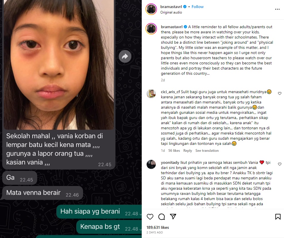 "Miris ketika mengetahui bahwa physical bullying sekarang bisa terjadi bahkan sedini pendidikan sekolah dasar. Sedih ketika mengetahui bahwa adik-adik kita sekarang kelewatan batas ketika 'bercanda'," tulis Verrell Bramasta dilihat pada unggahannya.
