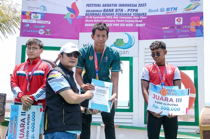 Selanjutnya Bupati yang akrab disapa Pak Yes ini juga berkesempatan untuk memberikan apresiasi berupa pengalungan medali kepada pemenang kategori 5 Km, yang kebetulan merupakan perwakilan Jawa Timur Izzy Dwifaiva Heriyanthi. Performa renang Izzy berhasil menggapai finish pertama dengan catatan 1 jam 21 menit 17,6 detik.