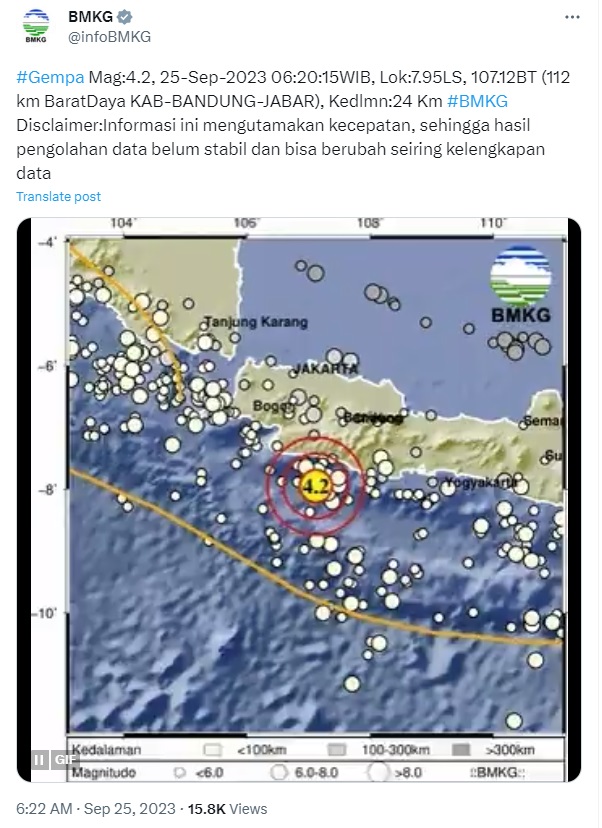 "Info Gempa Mag:4.3, 25-Sep-23 06:20:16 WIB, Lok:7.91 LS - 107.10 BT (109 km BaratDaya KAB-BANDUNG-JABAR), Kedlmn: 33 Km ::BMKG." tulis Twitter BMKG Wilayah 2.