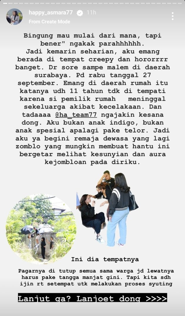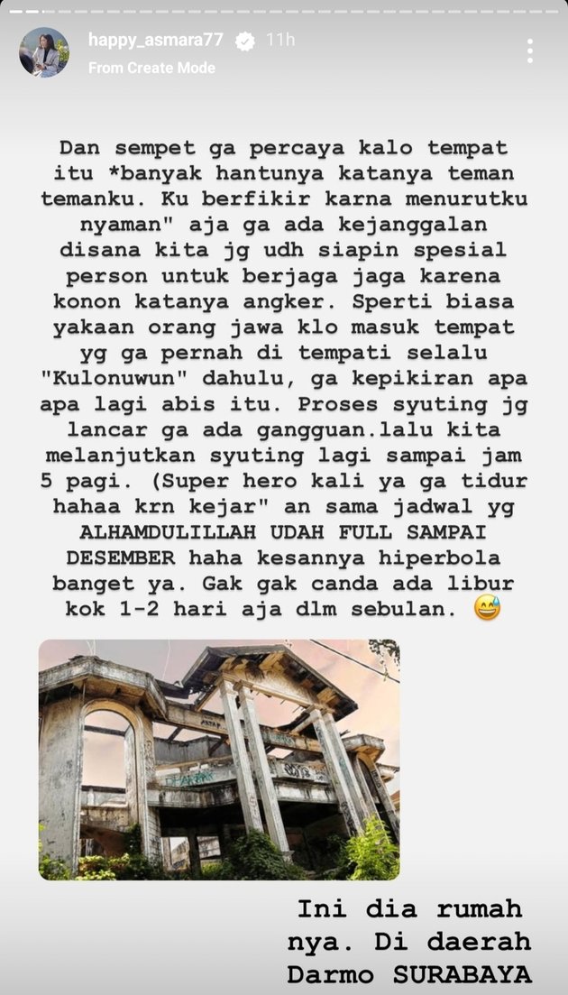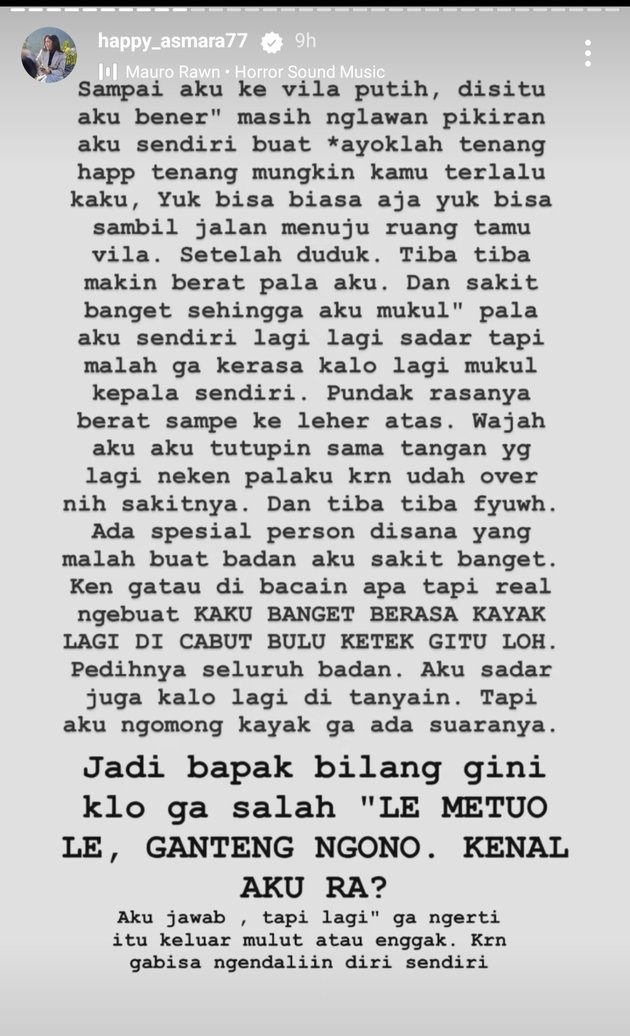 "Sekitar jam 5 pagi, setelah syuting tepatnya tgl 28 september aku otw lah ke Pasuruan untuk bekerja lagi, keadaan lagi pms jadi tu kyk semangat" nya kerja banget. Nah sampai lah aku di vila putih, tempat transit aku buat nyanyi di pintu langit," demikian kata Happy di unggahan story-nya, dikutip Minggu (01/10/2023).