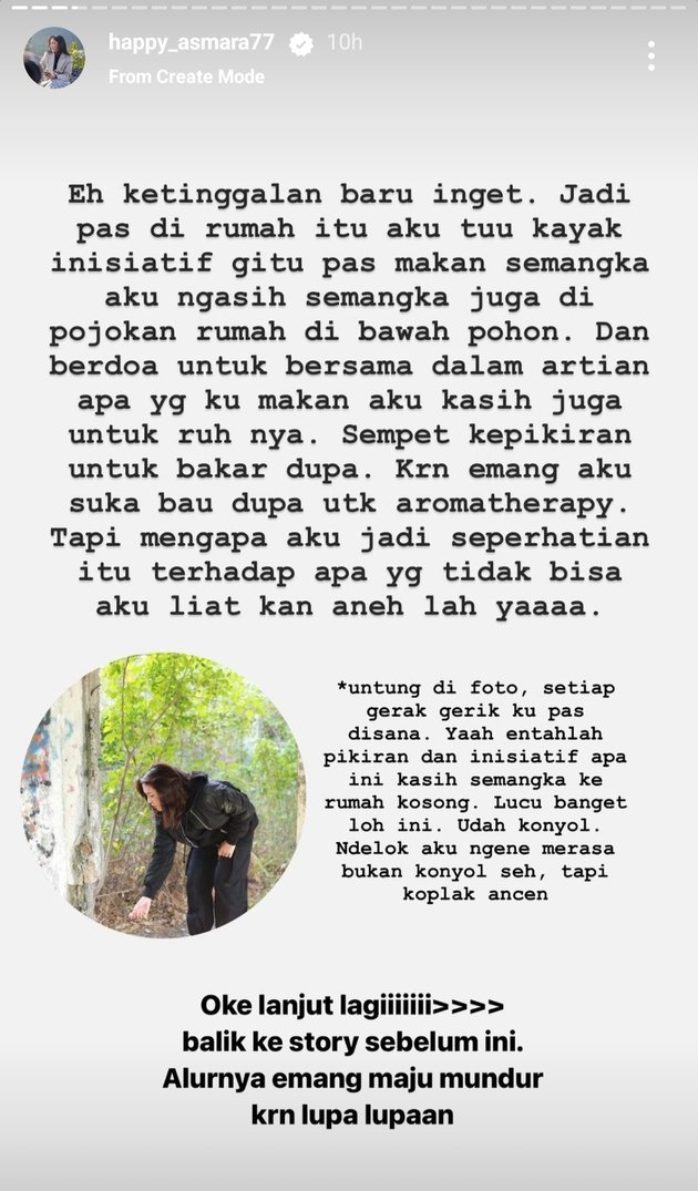 Saat itu, ia tiba-tiba ingin memberikan semangka di rumah itu dengan harapan makanannya juga bisa dimakan oleh ruh yang ada di tempat itu. Mulanya, Happy Asmara tak merasa ada yang janggal. Namun tiba-tiba ketika bangun tidur ia merasa pegal-pegal.