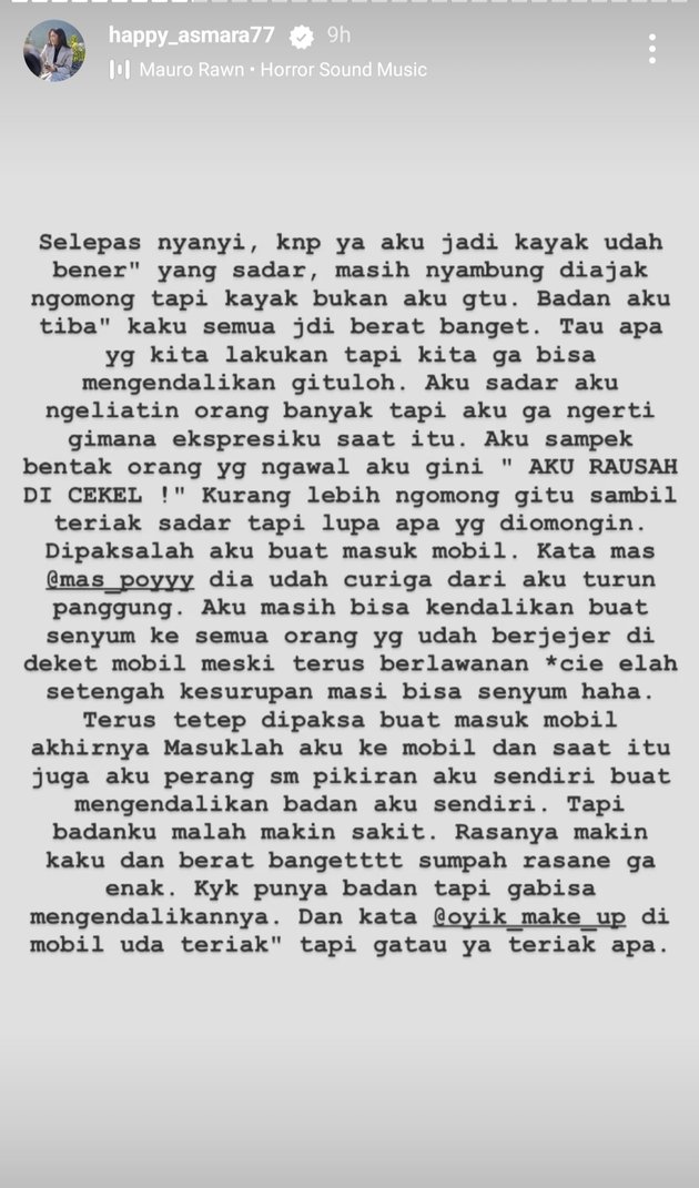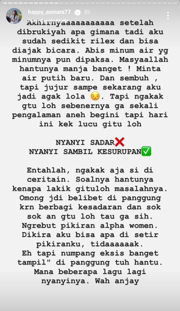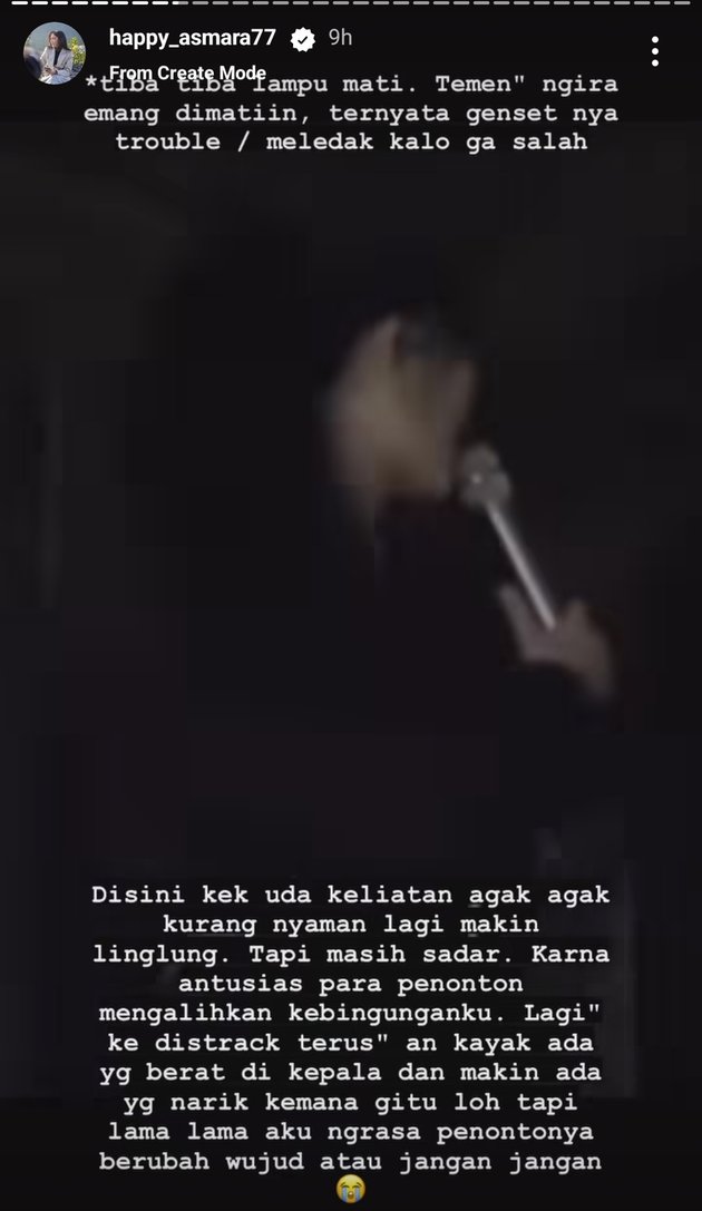 Bahkan saat kejadian tersebut, Happy sempat menceritakan momen antara sadar dan tak sadar saat bernyanyi hingga turun dari panggung dalam story akun Instagramnya.