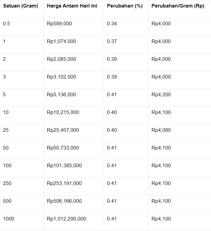 Melansir dari situs Pegadaian, harga emas Antam ukuran 1 gram dibanderol Rp 1.074.000 terpantau naik Rp 4.000 dari sebelumnya. Adapun kenaikan untuk seluruh ukuran sebelumnya berkisar di Rp 4.000 - Rp 4.200.