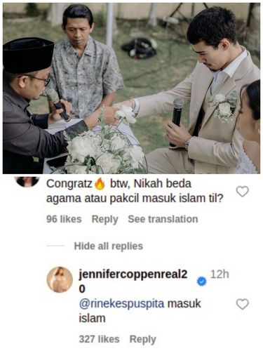 "Nikah secara islam brt mr dali masuk islam masya allah, ikut sneeng sih sumpah bahagia selalu ya kak jen," sahut akun @rer***.
