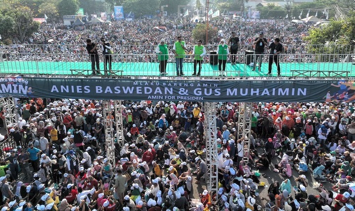 Tak berselang lama, Anies Anies juga datang menyusul cawapresnya. Ia naik ke atas panggung yang berbentuk jembatan melintang itu. “Mas Anies, tercatat yang datang 1,2 juta orang,” ujar Cak Imin.