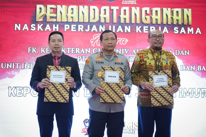 SURABAYAPAGI.COM, Surabaya - Fakultas Kedokteran Gigi Universitas Airlangga (FKG Unair) dan PT. PLN (Persero) Unit Induk Pembangunan Jawa Bagian Timur dan Bali, melakukan penandatanganan naskah Perjanjian Kerja Sama (PKS) dengan Polda Jatim di Lobby Gedung Patuh Mapolda Jatim, Pada Senin (16/10/2023).