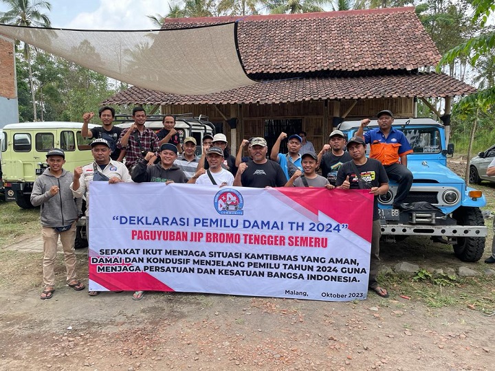 "Kami tegaskan bahwa Paguyuban Jip Bromo Tengger Semeru Malang yang membawahi dua kecamatan, turut serta menjaga kamtibmas saat pemilu 2024, sehingga pesta demokrasi kali ini bisa menghasilkan pemimpin yang amanah untuk rakyat Indonesia," tutur Wilda Hangga