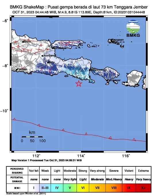 SURABAYAPAGI.com, Jember - Wilayah Jember, Jawa Timur baru saja diguncang gempa bumi bermagnitudo 4.9 pada Selasa (31/10/2023) pagi sekitar pukul 04.44 WIB. Gempa tersebut berada di kedalaman 68 Km.