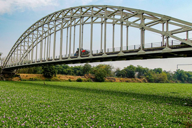 SURABAYAPAGI.com, Bojonegoro - Sungai Sungai Bengawan Solo, Bojonegoro, Jawa Timur terlihat menghijau jika dilihat dari atas lantaran dipenuhi dengan tanaman eceng gondok sejak Rabu (25/10/2023) lalu. Namun, fenomena aneh tersebut bisa berdampak buruk bagi lingkungan dan ekosistem di sungai tersebut.