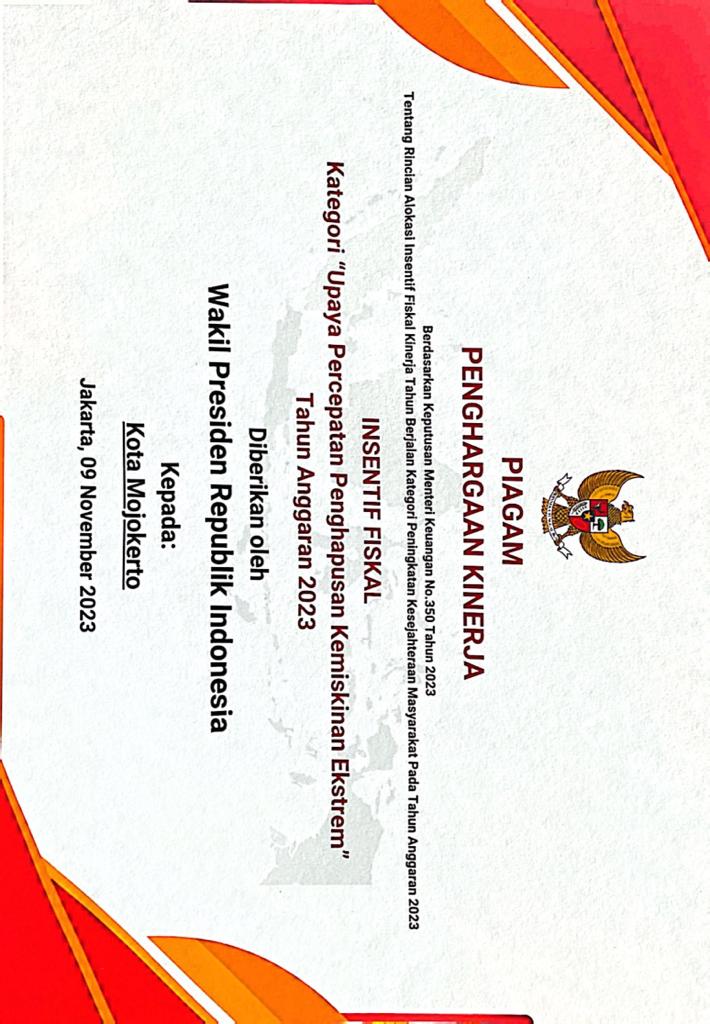 Pemkot Mojokerto mendapatkan penghargaan tersebut atas komitmennya dalam upaya penghapusan kemiskinan ekstrem di wilayahnya.