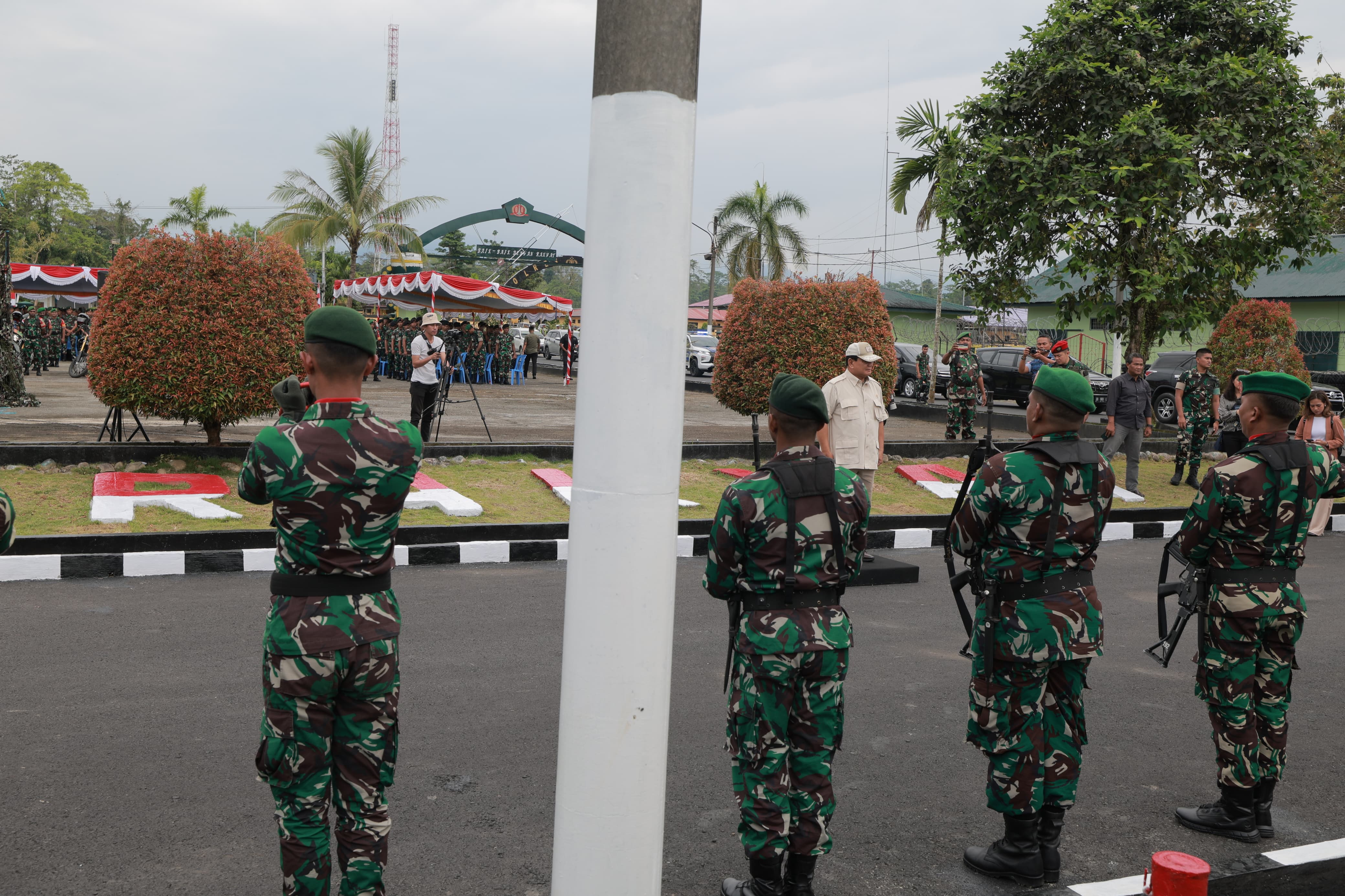 Prabowo tiba pukul 08:15 WIT mengenakan seragam safari coklat dan langsung disambut oleh Dandim Kodim 1710/Mimika Letkol Inf Dedy Dwi Cahyadi dengan prosesi jajar hormat.