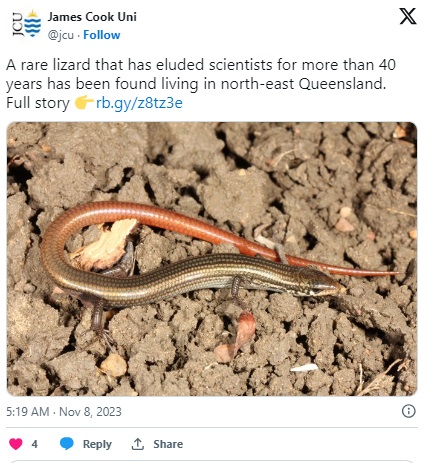 Andrew Amey, ahli herpetologi dari Queensland Museum sekaligus pemimpin ekspedisi, seperti dikutip LiveScience mengatakan, terdapat dua penemuan kadal lain yang langka dan terancam punah, yakni kadal Mount Surprise (Lerista storri) dan kadal bergaris halus tanpa kaki (Lerista ameles).