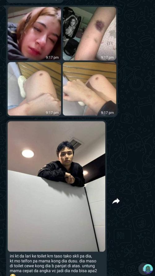 “Ini aku lagi lari ke toilet karena udah takut banget sama dia. Situasinya aku mau nelpon mama, terus di kejar sama dia. Dia masuk ke toilet wanita dan sampe manjat ke atas. Untungnya mama cepat angkat vc nya, jadi dia gak bisa apa-apa,” tulis potongan pesan singkat yang diterjemahkan dalam bahasa Indonesia, Kamis (16/11/2023).